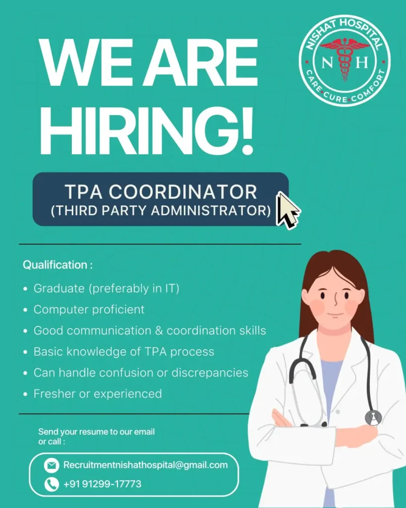 Nishat Hospital, a 50-bed multi-speciality hospital in Lucknow, is looking for a dedicated TPA Coordinator to manage Ayushman Bharat and other insurance-related procedures. The ideal candidate will be responsible for ensuring smooth claim processes, accurate documentation, and effective coordination between patients, doctors, and insurance bodies.